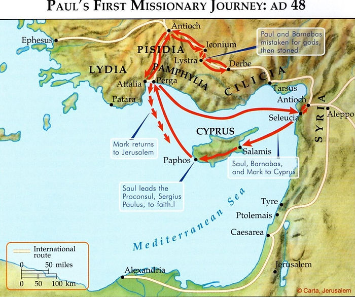 11. Paul and Barnabas taking John Mark with them, go on their 1st Missionary Journey circa 47-48 A.D. Acts 13:1-16, “Now there were at Antioch, in the church that was there, prophets and teachers: Barnabas, and Simeon who was called Niger, and Lucius of Cyrene, and Manaen who had been brought up with Herod the tetrarch, and Saul. (2) While they were ministering to the Lord and fasting, the Holy Spirit said, "Set apart for Me Barnabas and Saul for the work to which I have called them." (3) Then, when they had fasted and prayed and laid their hands on them, they sent them away. (4) So, being sent out by the Holy Spirit, they went down to Seleucia and from there they sailed to Cyprus. (5) When they reached Salamis, they began to proclaim the word of God in the synagogues of the Jews; and they also had John as their helper. (6) When they had gone through the whole island as far as Paphos, they found a magician, a Jewish false prophet whose name was Bar-Jesus, (7) who was with the proconsul, Sergius Paulus, a man of intelligence. This man summoned Barnabas and Saul and sought to hear the word of God. (8) But Elymas the magician (for so his name is translated) was opposing them, seeking to turn the proconsul away from the faith. (9) But Saul, who was also known as Paul, filled with the Holy Spirit, fixed his gaze on him, (10) and said, "You who are full of all deceit and fraud, you son of the devil, you enemy of all righteousness, will you not cease to make crooked the straight ways of the Lord? (11) "Now, behold, the hand of the Lord is upon you, and you will be blind and not see the sun for a time." And immediately a mist and a darkness fell upon him, and he went about seeking those who would lead him by the hand. (12) Then the proconsul believed [in the Lord Jesus Christ] when he saw what had happened, being amazed at the teaching of the Lord. (13) Now Paul and his companions put out to sea from Paphos and came to Perga in Pamphylia; but John left them and returned to Jerusalem. (14) But going on from Perga, they arrived at Pisidian Antioch, and on the Sabbath day they went into the synagogue and sat down. (15) After the reading of the Law and the Prophets the synagogue officials sent to them, saying, "Brethren, if you have any word of exhortation for the people, say it." (16) Paul stood up, and motioning with his hand said, "Men of Israel, and you who fear God, listen:” Acts 13:42-14-28, “As Paul and Barnabas were going out from [the synagogue in Antioch of Pisidia], the people kept begging that these things might be spoken to them the next Sabbath. (43) Now when the meeting of the synagogue had broken up, many of the Jews and of the God-fearing proselytes followed Paul and Barnabas, who, speaking to them, were urging them to continue in the grace of God. (44) The next Sabbath nearly the whole city assembled to hear the word of the Lord. (45) But when the Jews saw the crowds, they were filled with jealousy and began contradicting the things spoken by Paul, and were blaspheming. (46) Paul and Barnabas spoke out boldly and said, "It was necessary that the word of God be spoken to you first; since you repudiate it and judge yourselves unworthy of eternal life, behold, we are turning to the Gentiles. (47) "For so the Lord has commanded us, `I have placed you as a light for the gentiles that you may bring salvation to the end of the earth.' " (48) When the Gentiles heard this, they began rejoicing and glorifying the word of the Lord; and as many as had been appointed to eternal life believed. (49) And the word of the Lord was being spread through the whole region. (50) But the Jews incited the devout women of prominence and the leading men of the city, and instigated a persecution against Paul and Barnabas, and drove them out of their district. (51) But they shook off the dust of their feet in protest against them and went to Iconium. (52) And the disciples were continually filled with joy and with the Holy Spirit. (1) In Iconium they entered the synagogue of the Jews together, and spoke in such a manner that a large number of people believed, both of Jews and of Greeks. (2) But the Jews who disbelieved stirred up the minds of the Gentiles and embittered them against the brethren. (3) Therefore, they spent a long time there speaking boldly with reliance upon the Lord, who was testifying to the word of His grace, granting that signs and wonders be done by their hands. (4) But the people of the city were divided; and some sided with the Jews, and some with the apostles. (5) And when an attempt was made by both the Gentiles and the Jews with their rulers, to mistreat and to stone them, (6) they became aware of it and fled to the cities of Lycaonia, Lystra and Derbe, and the surrounding region; (7) and there they continued to preach the gospel. (8) At Lystra a man was sitting who had no strength in his feet, lame from his mother's womb, who had never walked. (9) This man was listening to Paul as he spoke, who, when he had fixed his gaze on him and had seen that he had faith to be made well, (10) said with a loud voice, "Stand upright on your feet." And he leaped up and began to walk. (11) When the crowds saw what Paul had done, they raised their voice, saying in the Lycaonian language, "The gods have become like men and have come down to us." (12) And they began calling Barnabas, Zeus, and Paul, Hermes, because he was the chief speaker. (13) The priest of Zeus, whose temple was just outside the city, brought oxen and garlands to the gates, and wanted to offer sacrifice with the crowds. (14) But when the apostles Barnabas and Paul heard of it, they tore their robes and rushed out into the crowd, crying out (15) and saying, "Men, why are you doing these things? We are also men of the same nature as you, and preach the gospel to you that you should turn from these vain things to a living God, who made the heaven and the earth and the sea and all that is in them. " (16) In the generations gone by